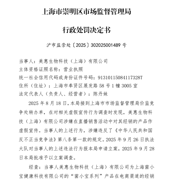 日前,益生菌品牌“菌小宝”的电商渠道经销商因正在曲播中通俗食物可“改善妇科炎症”,被上海市崇明区市场监视办理局处以3万元罚款。2025年“618”大促期间,美惠生物做为菌小宝电商渠道经销商正在有赞平台菌小宝旗舰店曲播时,将通俗食物“太空30号”宣传为女性私护专属并声称其能10天改善私密、缓解妇科炎症,以至处理外阴白斑惹起的瘙痒。经监管部分查实,该产物仅为通俗食物,无任何医治功能,其宣传内容违反《中华人平易近国反不合理合作法》,形成虚假且惹人的贸易宣传。