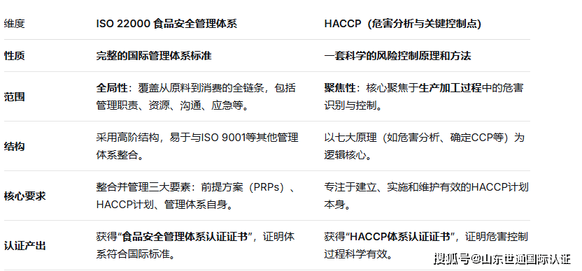 最底子的区别正在于,ISO 22000是一个完整的“食物平安办理系统”国际尺度,而HACCP是一套专注于风险节制的“科学道理和方式”。能够说,HACCP是ISO 22000这颗皇冠上最璀璨的宝石,但皇冠本身还镶嵌着其他不成或缺的构成部门。它采用取ISO 9001质量办理系统不异的高阶布局,强调系统的筹谋、运转、评价和改良。其焦点正在于 “整合” ,要求企业将HACCP道理取前提方案(PRPs,即根基的卫生和出产前提)以及《食物平安办理系统 要求》本身无机融合,构成一个同一、协调的办理系统。它关心的不只仅是出产过程中的风险节制,还涵盖了沟通、应急预备、逃溯系统以及持续改良等更普遍的办理职责。